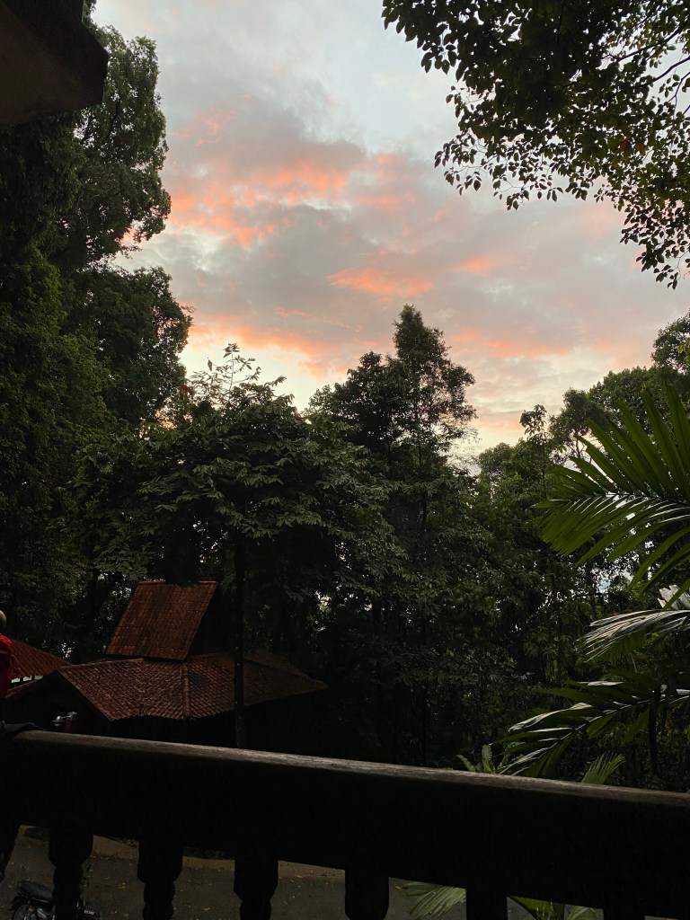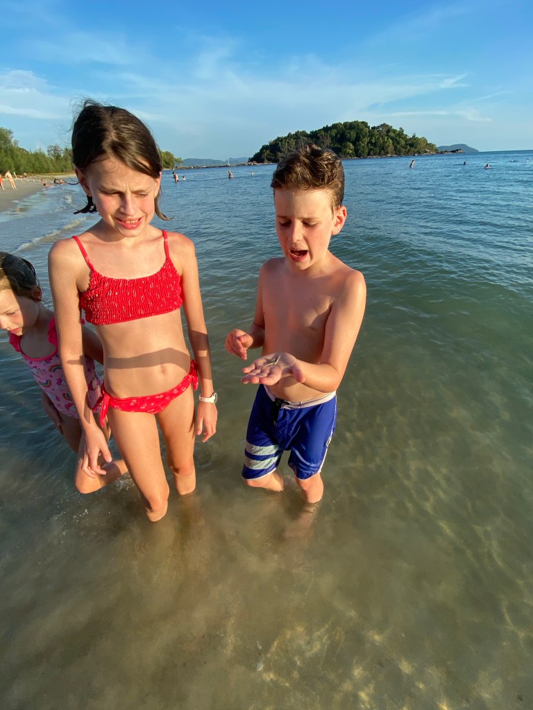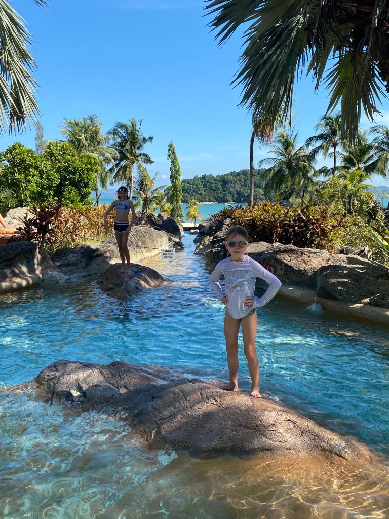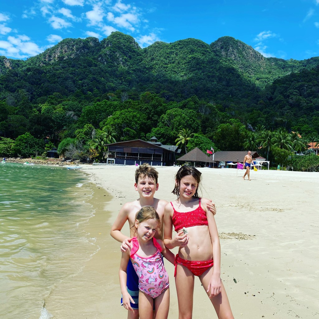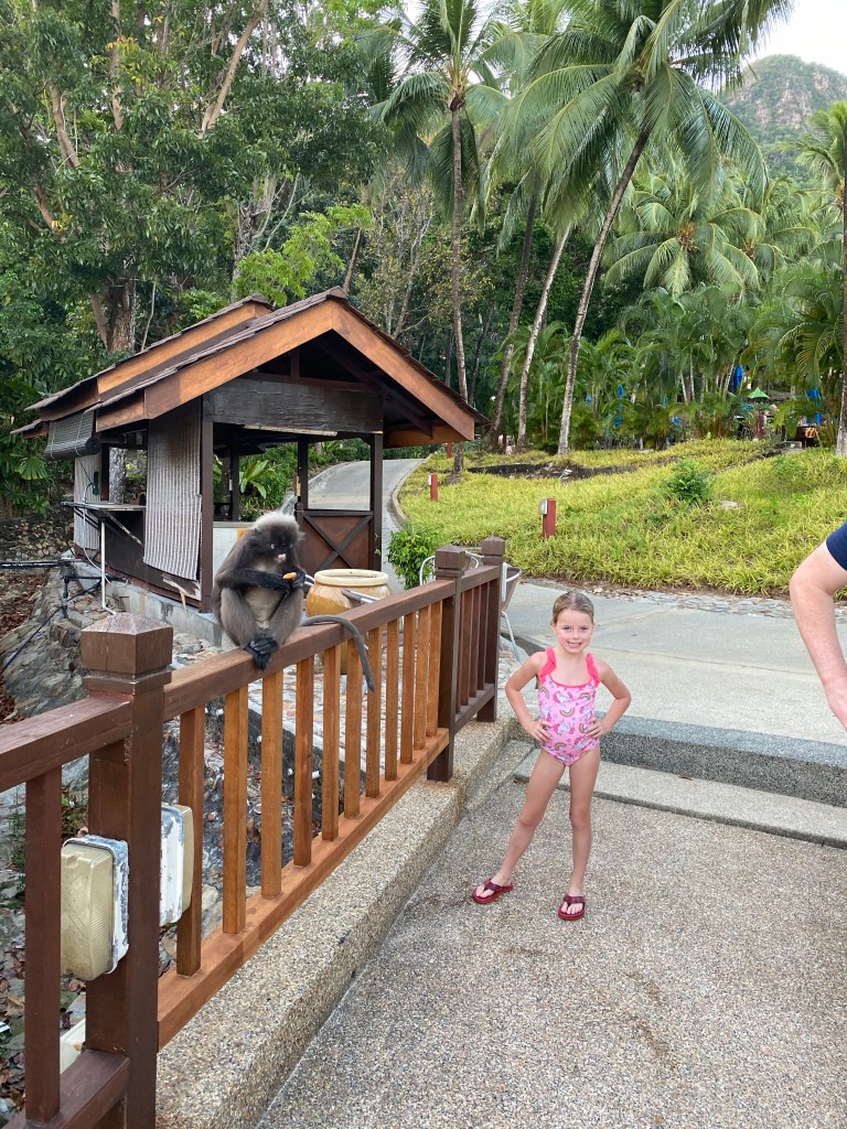 Airport in Langkawi. The kids loved getting off right on the tarmac. Langkawi is the northernmost part of Malaysia. It’s known as the “jewel of Kedah” for its beauty. It’s actually an archipelago of 99 islands of which only 3 are inhabited (we think all are inhabited by monkeys!). Langkawi means island of the reddish brown eagle. It is known for its eagles, beautiful topography and lush rainforest. After a 20 minute car ride, we were at our resort, the Berjaya. There are a lot of resorts on the island and it was difficult to choose. Traveling as a family of 5 is a challenge. We didn’t think we were ready to try an air b&b yet (and were glad we didn’t on langkawi) but a lot of the hotels and resorts don’t have rooms that accommodate us (were also not ready to try separate rooms they aren’t attached) So when I was looking, the Berjaya had a “family” room (which was 2 rooms attached, one with a king bed, one with 2 twins). They “allowed” us to violate the 4 people rule for this room. I also liked the location. Close to the cable car and set on a beach and in the rainforest. The resort itself was a little “meh”. It’s an extremely large resort (you have to take shuttle buses to get back and forth to your chalets). The size means it’s also a little “tired”. But, the beach and pool were lovely, the food was good and wildlife wonderful so despite that, overall our experienced was positive. I’d also add, we are a little jaded. We’ve stayed in some lovely hotels over the years and live in a beautiful resort like condo in Singapore. We’re spoiled and are ruining our children. Our room was the two balconies on the bottom. Building sand castles Finding starfish (Ella was the only one who could spot them on the sand)The resort is set between a beach and the Machinchang geopark rainforest. Friday we spent the day enjoying the resort, The pool and the beach. The kids loved both equally and Ryan and I really enjoyed the swim up pool bar with cheap drinks! Beers here cost the same as in Singapore. 15 but instead of S$ it’s Ringitts at a 3:1 (4:1 to the US $). We love that exchange rate!Being in the rainforest, there were so. Many. Monkeys. There were signs EVERYWHERE at the resort not to feed them. But monkeys are smart. They watch. As soon as food or a bag is unattended, they grab it. This one is a dusky leaf monkey eating a piece of pizza. This is about as close as you can get to them. They are wild. Ryan tried to take a portrait of one and got hissed at. They have sharp looking teeth!We watched the sunset over the mountain before heading back to the room to clean up for dinner. Friday night we made probably our biggest goof of the trip. The resort had 5 restaurants. One was a Thai restaurant out on a pier. It looked great. The only reservation they had left was 8:30. We said yes, our kids eat late, they’ll be fine, we thought. Ha! We didn’t take into account the 5:45 wake up and all day playing on the beach and pool. They were a disaster and we were dining with a bunch of honeymooners and people on once in a lifetime trips. On Valentine’s Day. Oops. We muddled through and the lovely staff was afraid we didn’t like our meal and offered us another (this dinner was include with our room). We took our exhausted minions back to the room and plunked them in bed ASAP before we caused and honeymooners to decide to forgo having children!The next morning Avery and I sat on the balcony and listened to the birds and watched for monkeys. Little did we know what we were wishing for…