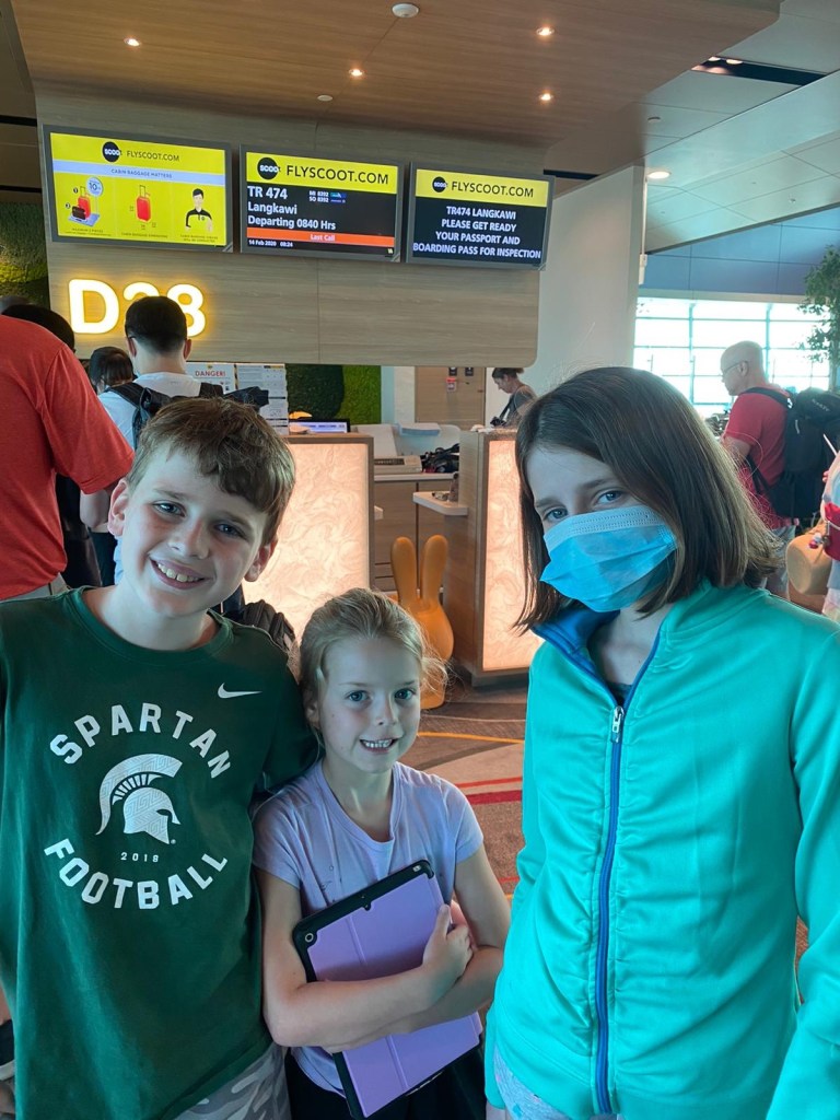 Our flight was 8:45am on Friday morning. We left the condo at 6:15 with our Purell and face masks. We were through security and eating breakfast by 7:15. Amazing to be so close to the airport and to live near such an efficient airport! Avery and Liam quickly declared they hated the face masks and they’d rather get the virus. So much for masking up! Ryan, Ella and I did wear them on the way to Langkawi. None of us wore them home on Sunday night…