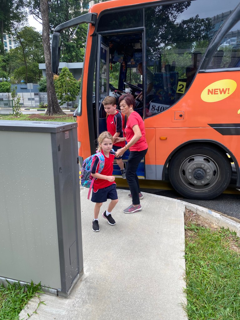 The bus auntie making sure they get safely off the bus. No chance to trip here!