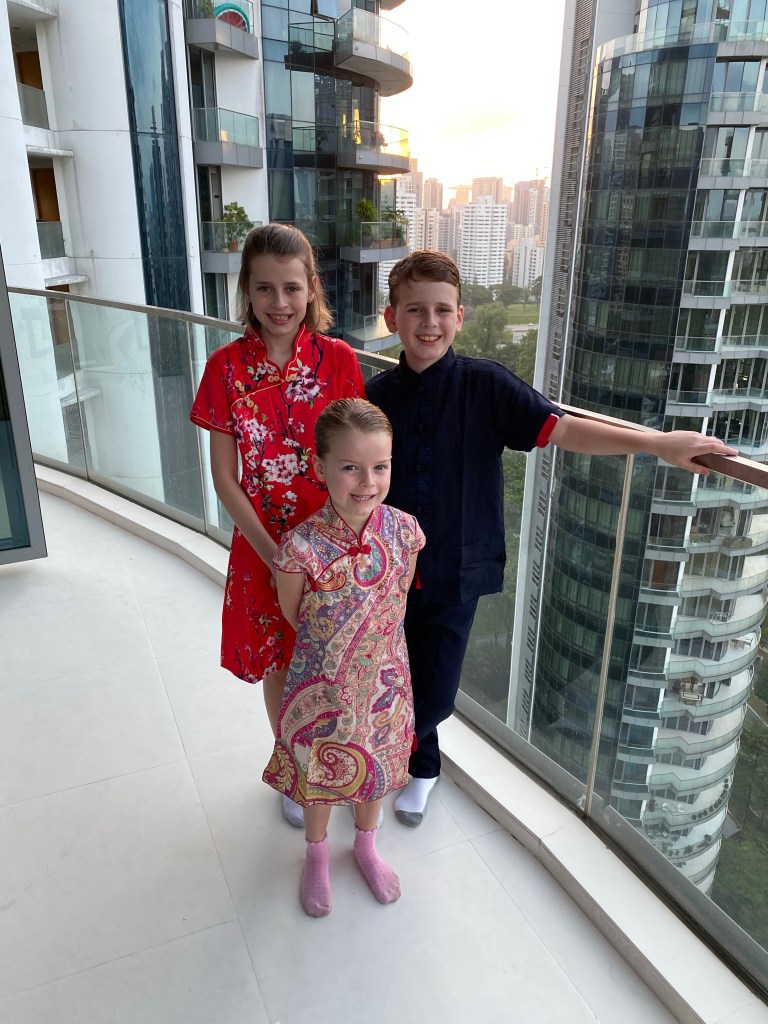 There are celebrations for a month! On Thursday the kids celebrated in school. We were told they could dress up if they wanted. The dresses are call cheongsam (traditional Chinese dress). None of the kids were sure they wanted to wear them (I was all in, they are adorable, cultural appropriation at its finest). Avery was the easiest, Mrs Sapna said they all dress up. Bought a cute dress at the tanglin mall one day while picking up groceries. Done! Liam and Ella were much more difficult. I spoke with Liamās teacher who said the boys were usually 50/50 on dressing up. I didnāt have anyone to ask for Ella and middle school kids are so fickle… one of her friend said she was, the other wasnāt. Hmm. Finally the night before, they both decided they wanted to wear them. Off to great world city mall we went (where I had seen clothes for them at a pop up market a few days before). Liam ended up with a super cute, navy linen (which he loved, said it felt like PJs). Ella was adult sized!?! She chose a traditional red floral print. So cute!