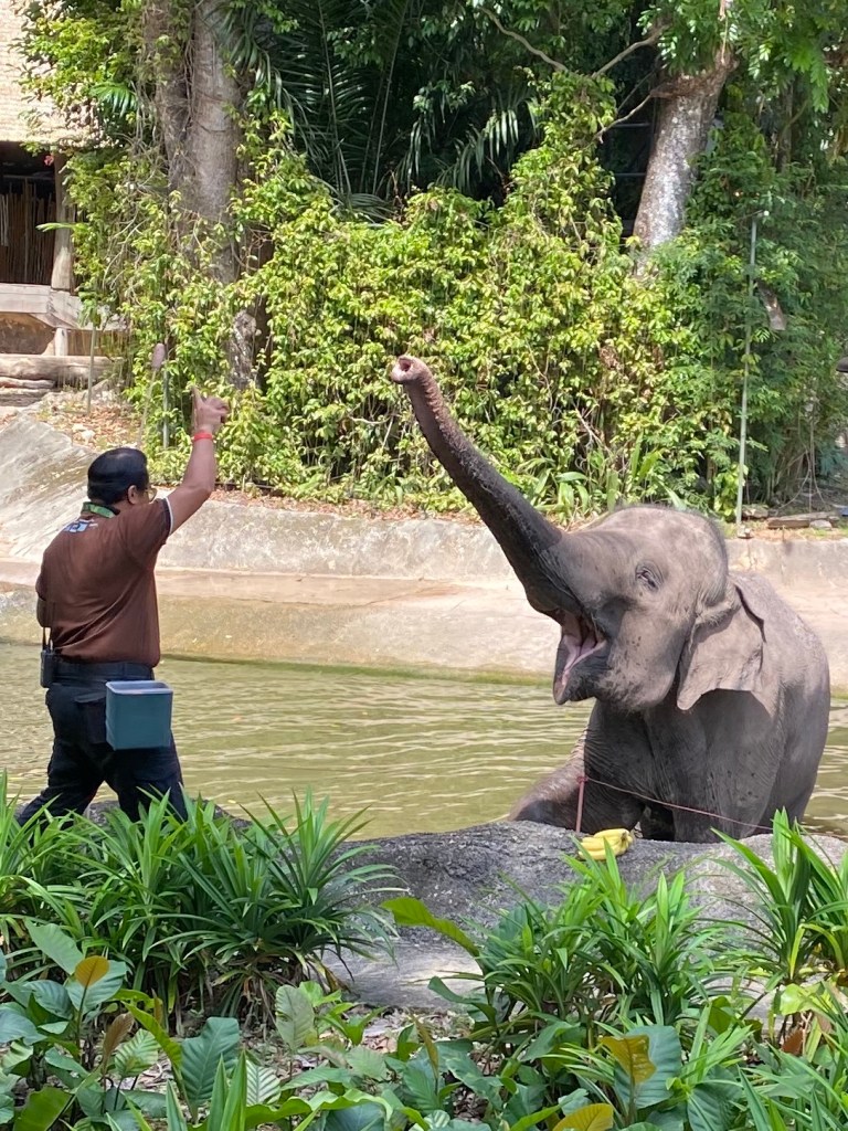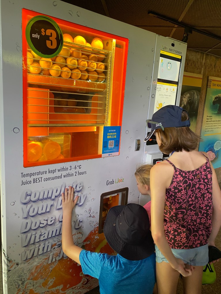 According to travel advisor.com, itās a top 3 zoo in the world! I believe it!First animal… a white tiger (they are not albino, but a gene variant that is very rare). The cool history about this tiger is itās ancestor was caught in India in the 1950s and given to a Maharaja. From this one, they have bred 35, all in captivity around the world. Miniature hippos! Fun fact. They actually cant swim, but ādanceā along river beds. They were super cool!Juice break! These machines are all over Singapore and the kids are obsessed. Finally gave in. Fun to watch it squeeze the juice and it was delicious. I see many more i.Joozās in our future!Next up were Australian animals. Very fun kangaroos and wallabyās. Baboons with red butts!!! Ella said she is still traumatized. The other funny quote is a mom was climbing to the top of a big rock and a ākidā sized baboon was following her. She shoved it totally off the rock to which Liam said āmom, kinda like you when weāre annoying you!ā Yikes. Truth hurts. We happened upon the elephant show! These are Indonesian elephants. They were amazing and we now canāt wait to go to a sanctuary! Did you know they can eat coconuts and durians whole? Thatās some serious stomach acid. It also brought up a good conversation with the kids. Having elephants in captivity is ethically dubious at best. However, the Singapore zoo raises a lot of money to help elephants in the wild. So does the keeping of the 6 elephants here make sense since they can help hundreds of others? I donāt know the answer either! You could feed them for $5 as well but since the line was long and we know seeing elephants is on our travel list, we moved along. Orangutans!!! The zoo is known for their orangutans. They have the ability to climb around a large part of the zoo. They are amazing. Another animal we are hoping to see in the wild as one of their few remaining habitats is only a short plane ride from Singapore!Avery really wanted to go to this rainforest live show. It meant we had to backtrack in the huge zoo. Liam and Ella were not pleased but Avery stuck in her heels on it. Good thing she did! It was a wonderful show! This is an albino peacock. We saw birds flying almost touching our heads, snakes, and many other critters! If you are ever at the Singapore zoo, go to as many shows as you can!