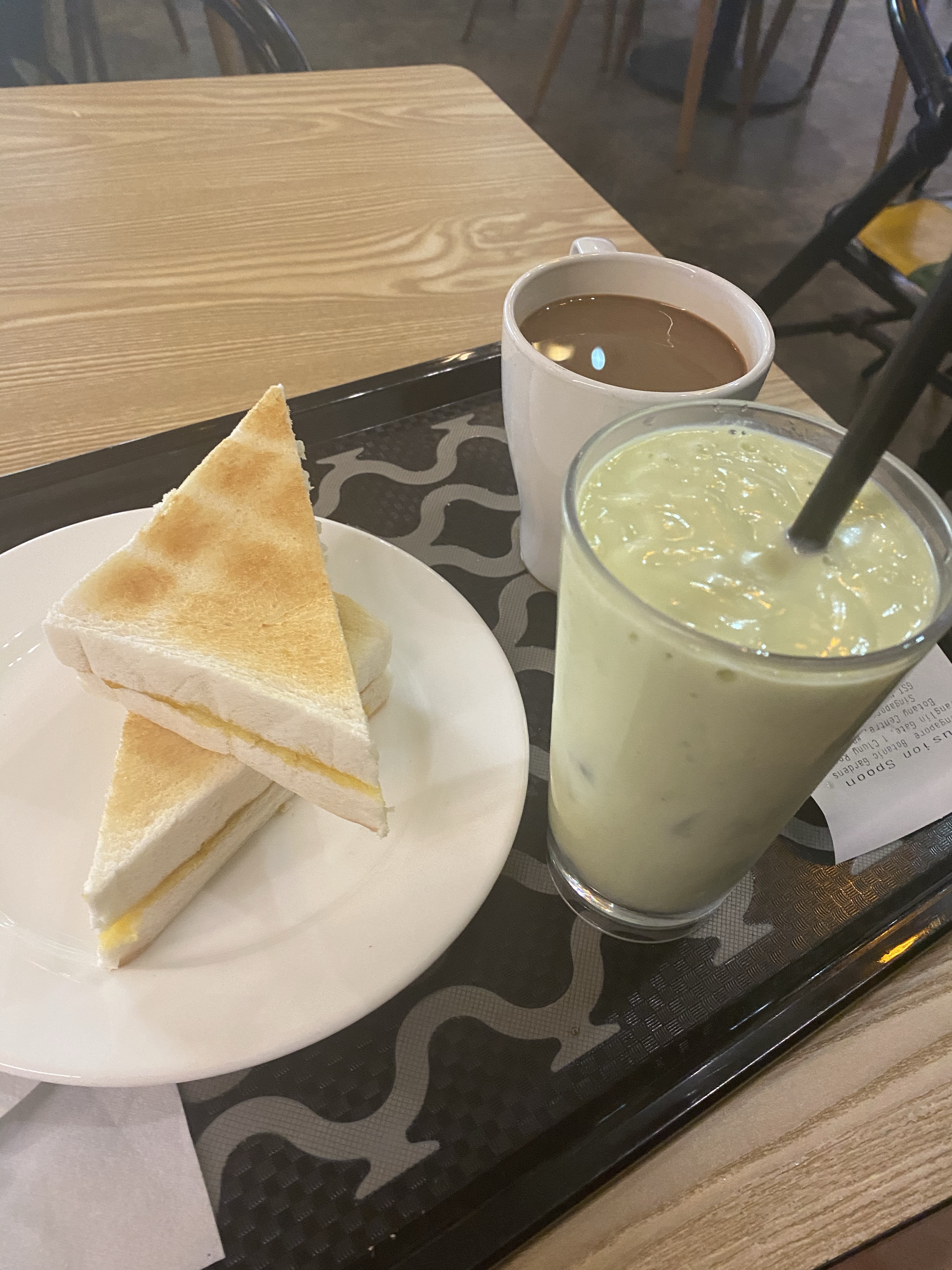 I love this little cafe. I got the kaya toast set and an avocado milk. Kaya toast is a Singaporean thing. It’s toast with butter and kaya spread (made of coconut and pandan). I love it. Typically you have it with a Kopi (Singaporean coffee, strong coffee with condensed milk) and soft boiled eggs which you dip the toast into. They don’t offer the eggs here which is too bad as I love that. Yummy special treat.