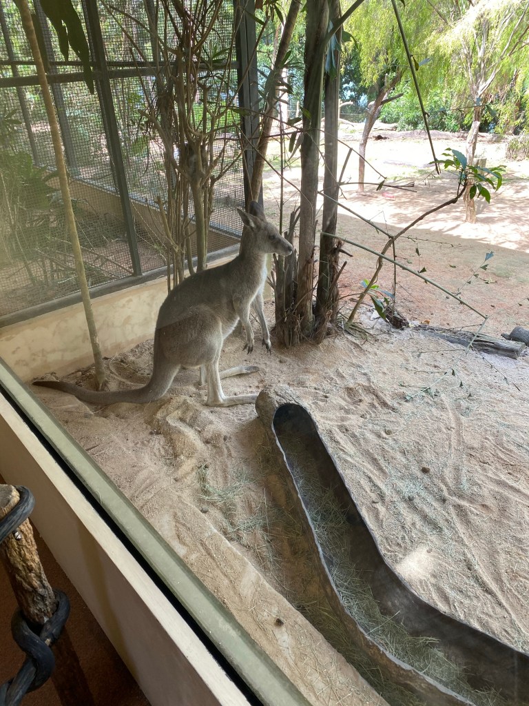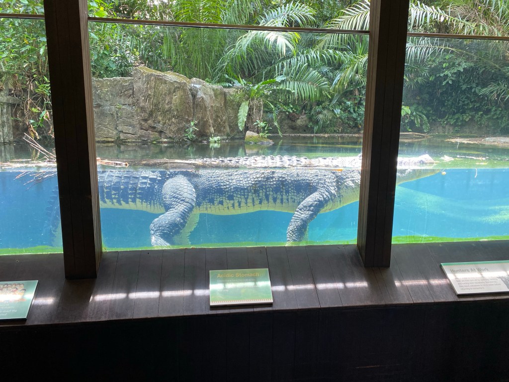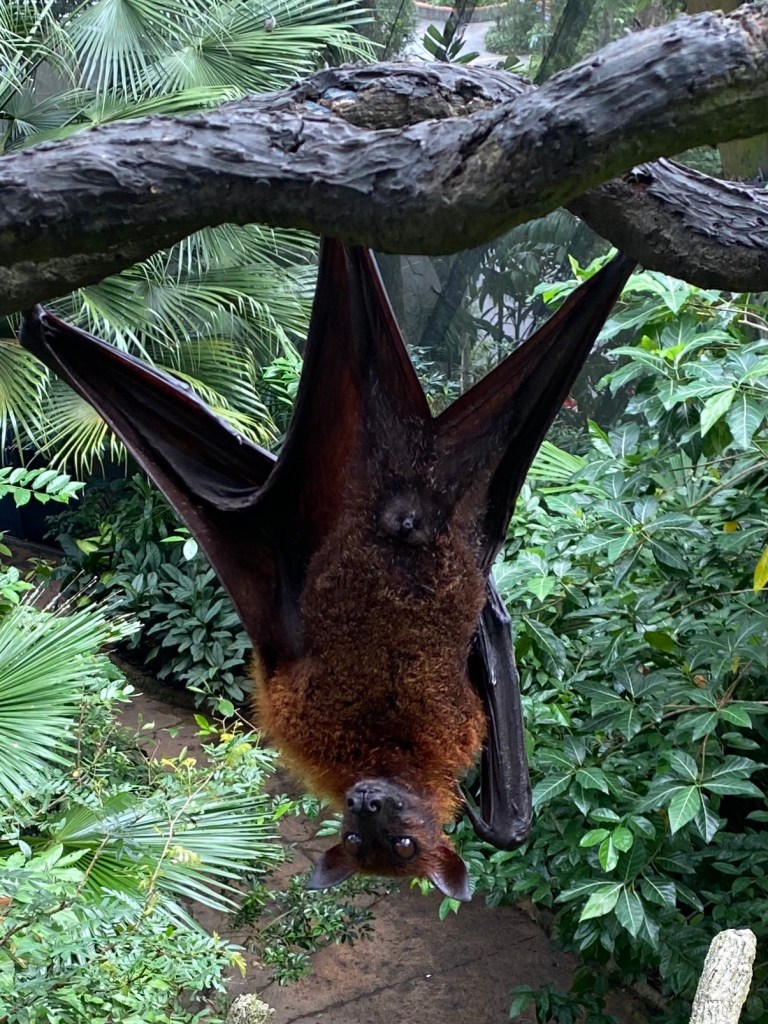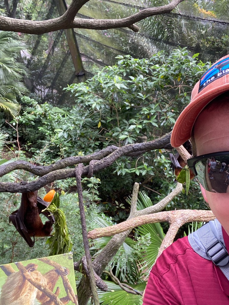 A parrot squabble. Watch till the end (but turn sound down!) when Ryan gets buzzed. We then had lunch. This was the best zoo or amusement park lunch iāve ever had. I got Indian, Liam and Avery had ramen and Ella and Ryan stuck with western fare. Everyone left full and happy! Other fun fact… the restaurant is named for the zoos most famous resident, Ah Meng, an orangutan. When she died in 2008, she was so famous, 4,000 people came to her funeral! Salt water crocodiles. You can see these in the wild here if you hike in certain places. I had no clue how big they are! They can get up to 9meters!!! I think we might skip those hikes…Ryan couldnāt resist a selfie with it. I really wished it opened its mouth!!!The zoo also has an amazing āsplash padā. We took about an hour break. I only wish I had brought my swim suit!Bat selfie. These are called flying foxes but they are bats. We were so close to them! Crazy!White rhinos!